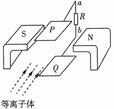 4.如图所示是磁流体发电机的示意图,两平行金属板 $P、Q$ 之间有一个很强的磁场. 一束等离子体(高温下电离的气体,含有大量正、负带电粒子)沿垂直于磁场方向喷入磁场. 将 $P、Q$ 与电阻 $R$ 相连接. 下列说法正确的是 ( )
