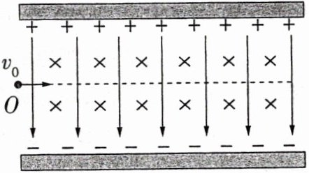 3.[2021 福建]一对平行金属板中存在匀强电场和匀强磁场,其中电场的方向与金属板垂直,磁场的方向与金属板平行且垂直纸面向里,如图所示. 一质子 ($_{1}^{1}H$) 以速度 $v_{0}$ 于 $O$ 点沿中轴线射入,恰沿中轴线做匀速直线运动. 下列粒子分别自 $O$ 点沿中轴线射入,能够做匀速直线运动的是(所有粒子均不考虑重力的影响) ( )
