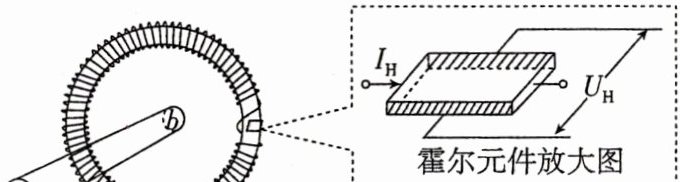 6.[2023 浙江 1 月]某兴趣小组设计的测量大电流的装置如图所示,通有电流 $I$ 的螺绕环在霍尔元件处产生的磁场 $B = k_{1}I$,通有待测电流 $I'$ 的直导线 $ab$ 垂直穿过螺绕环中心,在霍尔元件处产生的磁场 $B' = k_{2}I'$. 调节电阻 $R$,当电流表示数为 $I_{0}$ 时,元件输出霍尔电压 $U_{H}$ 为零,则待测电流 $I'$ 的方向和大小分别为 ( )