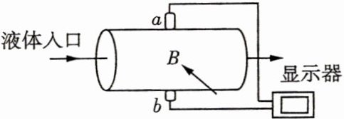 5.如图所示,电磁流量计的测量管横截面直径为 $D$,在测量管的上、下两个位置固定两金属电极 $a、b$,整个测量管处于水平向里的匀强磁场中,磁感应强度大小为 $B$. 当含有正、负离子的液体从左向右匀速流过测量管时,连在两个电极上的显示器显示的流量为 $Q$(单位时间内流过测量管某横截面的液体体积),下列说法正确的是 ( )