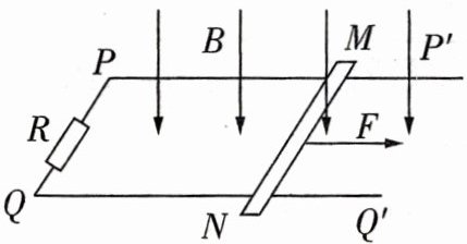 3. [右手定则/2023 广东佛山模拟]如图所示,光滑平行金属导轨$PP'$和$QQ'$,都处于同一水平面内,$P$和$Q$之间连接一电阻$R$,整个装置处于竖直向下的匀强磁场中. 现在垂直于导轨放置一根导体棒$MN$,用一水平向右的力$F$拉动导体棒$MN$,以下关于导体棒$MN$中的感应电流方向和它所受安培力的方向的说法正确的是 ( )