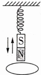 若用弹簧悬挂条形磁铁,磁铁下端的水平桌面上放一个固定的闭合铜环,并使磁铁上下振动,如图所示. 磁铁在向下运动的过程中,判断铜环给磁铁的磁场力方向.