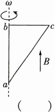 6.如图所示,直角三角形金属框$abc$放置在匀强磁场中,磁感应强度大小为$B$,方向平行于$ab$边向上. 当金属框绕$ab$边以角速度$\omega$逆时针转动时,$a$、$b$、$c$三点的电势分别为$U_{a}$、$U_{b}$、$U_{c}$. 已知$bc$边的长度为$l$. 下列判断正确的是 ( )