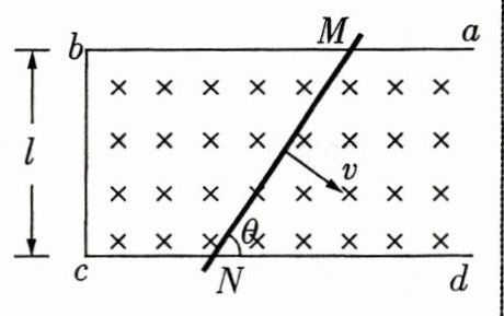 5.[2023 福建泉州模拟/多选] 如图所示,$abcd$为水平放置的 U 形光滑金属导轨,间距为$l$,导轨间有垂直于导轨平面的匀强磁场,磁感应强度大小为$B$,导轨电阻不计. 已知金属杆$MN$倾斜放置,与导轨成$\theta$角,单位长度的电阻为$r$,保持金属杆以速度$v$沿垂直于$MN$的方向滑动(金属杆滑动过程中与导轨接触良好),则 ( )