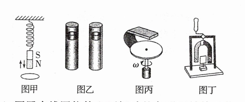 D. 图丁中转动把手时下面的闭合铜线框会随 U 形磁铁同向转动