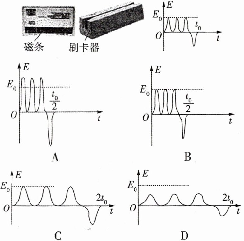 1.[电磁卡]磁卡的磁条中有用于存储信息的磁极方向不同的磁化区,刷卡器中有检测线圈. 当以速度$v_0$刷卡时,在线圈中产生感应电动势,其$E - t$关系如图所示. 如果只将刷卡速度改为$\frac{v_0}{2}$,线圈中的感应电动势随时间变化的$E - t$关系图可能是 ( )