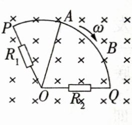 1.[多选]如图,$PAQ$为一段固定于水平面上的光滑圆弧导轨,圆弧的圆心为$O$,半径为$L$.空间存在垂直于导轨平面向下,磁感应强度大小为$B$的匀强磁场. 电阻为$R$的金属杆$OA$与导轨接触良好,图中电阻$R_{1}=R_{2}=R$,其余电阻不计. 现使$OA$杆在外力作用下以恒定角速度$\omega$绕圆心$O$顺时针转动,在其转过$\frac{\pi}{3}$的过程中,下列说法正确的是 ( )