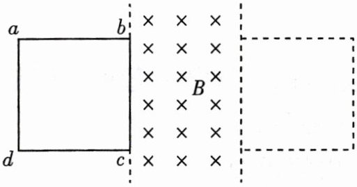 4. [正方形单匝线圈] 如图所示,电阻为$0.1\ \Omega$的正方形单匝线圈$abcd$的边长为$0.2\ m$,$bc$边与匀强磁场左边界重合. 磁场的宽度等于线圈的边长,磁感应强度大小为$0.5\ T$. 在水平拉力作用下,线圈以$8\ m/s$的速度向右匀速穿过磁场区域. 求在上述过程中