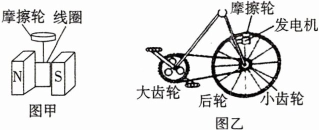 1. 有一种自行车,它有能向自行车车头灯泡供电的小型发电机,其原理示意图如图甲所示;图中 N、S 是一对固定的磁极,磁极间有一固定在绝缘转轴上的矩形线圈,转轴的一端有一个与自行车后轮边缘接触的摩擦轮. 如图乙所示,当车轮转动时,因摩擦而带动摩擦轮转动,从而使线圈在磁场中转动而产生电流给车头灯泡供电. 判断下列说法的正误.