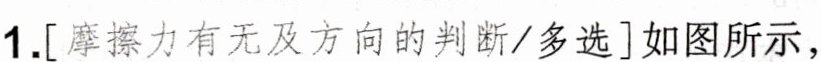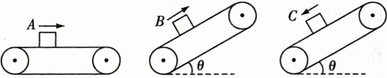 1. [摩擦力有无及方向的判断/多选]如图所示,$A、B、C$三个物体质量相等,它们与传送带间的动摩擦因数也相同. 三个物体随传送带一起匀速运动,运动方向如图中箭头所示,则下列说法正确的是 ( )