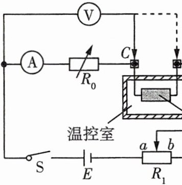 将温控室的温度设置为T,电阻箱$R_0$调为某一阻值$R_{01}$. 闭合开关S,调节滑动变阻器$R_1$,使电压表和电流表的指针偏转到某一位置. 记录此时电压表和电流表的示数、T和$R_{01}$. 断开开关S.