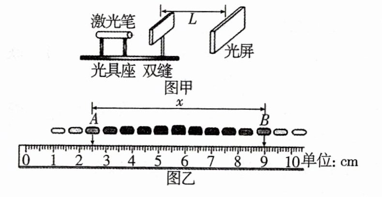 2.[2023海口模拟]某实验小组使用图甲的装置测量某红色激光的波长.用光具座固定激光笔和刻有双缝的黑色纸板,双缝间的宽度$d = 0.2$mm.激光经过双缝后投射到光屏中的条纹如图乙所示,由刻度尺读出$A$、$B$两亮纹间的距离$x =$______mm.通过激光测距仪测量出双缝到投影屏间的距离$L = 2.0$m,已知$\frac{\lambda}{d}=\frac{\Delta x}{L}$($\Delta x$为相邻两条亮纹间的距离)由此则可以计算该激光的波长$\lambda =$______m.如果用紫色激光重新实验,相邻亮纹间距会______(填“变大”“变小”或“不变”).