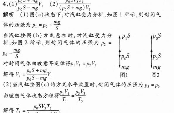 (1)将汽缸如图(b)竖直悬挂,缸内气体温度仍为$T_1$,求此时缸内气体体积$V_2$;