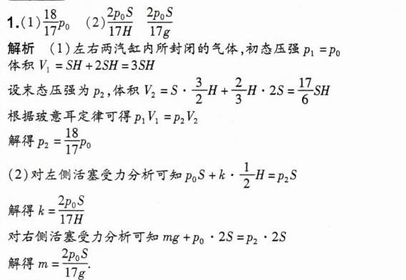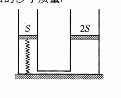 1.[2023 湖北]如图所示,竖直放置在水平桌面上的左右两汽缸粗细均匀,内壁光滑,横截面积分别为S、2S,由体积可忽略的细管在底部连通.两汽缸中各有一轻质活塞将一定质量的理想气体封闭,左侧汽缸底部与活塞用轻质细弹簧相连.初始时,两汽缸内封闭气柱的高度均为H,弹簧长度恰好为原长.现往右侧活塞上表面缓慢添加一定质量的沙子,直至右侧活塞下降$\frac{1}{3}H$,左侧活塞上升$\frac{1}{2}H$.已知大气压强为$p_0$,重力加速度大小为g,汽缸足够长,汽缸内气体温度始终不变,弹簧始终在弹性限度内.求: