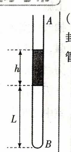2.如图所示,一上端开口、下端封闭的细长玻璃管AB竖直放置,管内用高$h = 25$ cm 的水银柱封闭了一段长$L = 29.4$ cm 的空气柱.已知外界大气压强为$p_0 = 75$ cmHg,封闭气体的温度为$T_1 = 27$℃.绝对零度取 - 273 K,$g$取10 m/s².则: