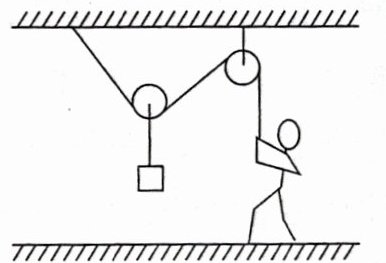 14. B 工人受到三个力的作用,即绳的拉力、地面的支持力和重力,三力平衡,A错;工人对绳的拉力和绳对工人的拉力是一对作用力与反作用力,B对;对动滑轮受力分析,由平衡条件有$2T\cos\frac{\theta}{2}=mg$,其中T为绳子拉力的大小、$\theta$为与动滑轮相连的两段绳的夹角、m为重物与动滑轮的总质量,随着重物的上升,$\theta$增大,则绳的拉力变大,CD错。