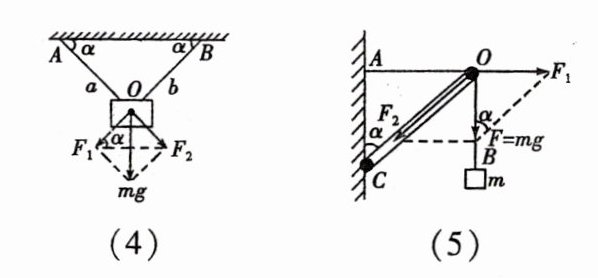 (5)质量为m的物体受细绳AO和轻杆OC(可绕C自由转动)的作用而静止,F1= **mgtanθ**,F2= **cosθmg**.
