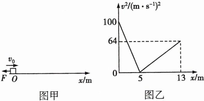 9.[根据运动图像求力/多选]如图甲所示,质量$m = 1\ kg$、初速度$v_{0}=10\ m/s$的物块,在一水平向左的恒力 F 作用下从 O 点沿粗糙的水平面向右运动,某时刻 F 突然反向,大小不变,整个过程中物块速度的平方随位置坐标变化的关系图像如图乙所示,$g = 10\ m/s^{2}$. 下列说法中正确的是 ( )