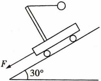 4. C 以小球为研究对象,分析其受力情况,小球受重力 $mg$、绳的拉力 $F_T$,因小球的加速度方向沿斜面向下,故 $mg$ 和 $F_T$ 的合力一定沿斜面向下。由牛顿第二定律有 $\frac{mg}{\sin30^{\circ}}=ma$,解得 $a = 2g$,再对小车和球组成的整体根据牛顿第二定律有 $F+(4m + m)g\sin30^{\circ}=5ma$,解得 $F = 7.5mg$,C 正确。