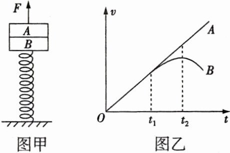 10.[多选]如图甲所示,一轻质弹簧的下端固定在水平面上,上端叠放两个质量均为$m$的物体$A$、$B$($B$与弹簧连接,$A$、$B$均可视为质点),弹簧的劲度系数为$k$,初始时物体处于静止状态. 现用竖直向上的拉力$F$作用在$A$上,使$A$开始向上做加速度大小为$a$的匀加速运动,测得$A$、$B$的$v - t$图像如图乙所示,已知重力加速度大小为$g$,则 ( )