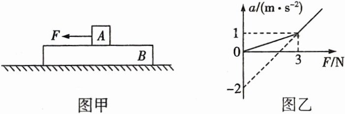 9.[多选]在光滑水平地面上放置一足够长的质量为$M$的木板$B$,如图甲所示,其上表面粗糙,在木板$B$上面放置一个质量为$m$、可视为质点的物块$A$,现在给$A$一个水平向左的拉力$F$,用传感器得到$A$的加速度随拉力$F$的变化关系如图乙所示,设最大静摩擦力等于滑动摩擦力,$g = 10$ m/s²,则 ( )