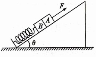 [命题条件拓展]如图,若将弹簧与物体$A$、$B$一起放在倾角为$\theta$的固定斜面上,斜面表面光滑,初始时物体处于静止状态. 现将拉力$F$作用于物体$A$使$A$向上做加速度大小为$a$的匀加速直线运动,求物体$A$和物体$B$分离时弹簧的形变量.