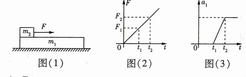 10.[$F - t$图像 + $a - t$图像/多选]水平地面上有一质量为$m_{1}$的长木板,木板的左端放有一质量为$m_{2}$的小物块,如图(1)所示. 用水平向右的拉力$F$作用在物块上,$F$随时间$t$的变化关系如图(2)所示,其中$F_{1}$、$F_{2}$分别为$t_{1}$、$t_{2}$时刻$F$的大小. 木板的加速度$a_{1}$随时间$t$的变化关系如图(3)所示. 已知木板与地面间的动摩擦因数为$\mu_{1}$,物块与木板间的动摩擦因数为$\mu_{2}$. 假设最大静摩擦力均与相应的滑动摩擦力相等,重力加速度大小为$g$. 则 ( )