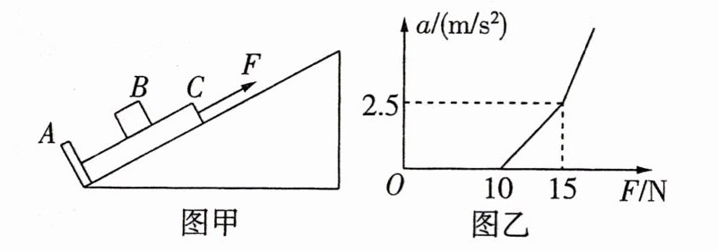 11.[$a - F$图像/2024 江苏扬州新华中学校考]如图甲所示,光滑斜面上有固定挡板$A$,斜面上叠放着小物块$B$和薄木板$C$,木板下端位于挡板$A$处,整体处于静止状态. 木板$C$受到逐渐增大的沿斜面向上的拉力$F$作用时,木板$C$的加速度$a$与拉力$F$的关系图像如图乙所示,已知最大静摩擦力等于滑动摩擦力,重力加速度$g = 10\ m/s^{2}$,则由图像可知下列说法正确的是 ( )