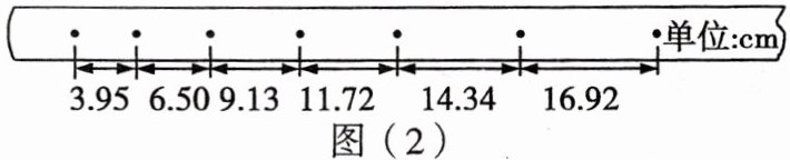 (2)把实验装置完全调整好以后,闭合打点计时器开关,释放小车,读出弹簧测力计的示数$F_1$. 打点计时器打出一条纸带如图(2)所示. 已知打点计时器使用的交流电频率为$50\ Hz$,相邻两个计数点之间还有$4$个点未画出. 根据纸带上测量的数据算出加速度的大小为$a_1 =$______$m/s^2$(结果保留3位有效数字).