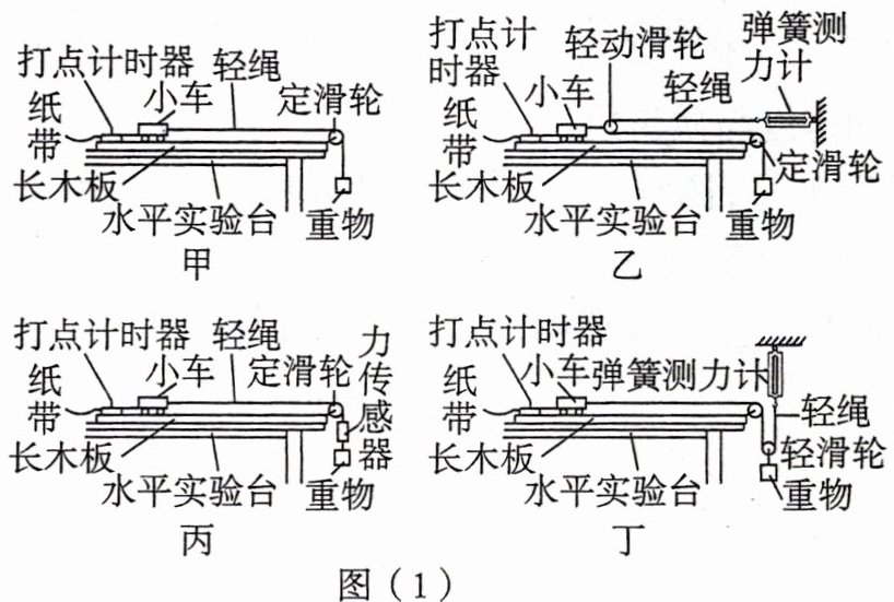 4.[实验方案的创新/2024湖南长郡中学质检]在某次探究加速度与力、质量的关系的实验中,甲、乙、丙、丁四位同学分别设计了如图(1)所示的实验装置,小车总质量用$M$表示,重物质量用$m$表示.