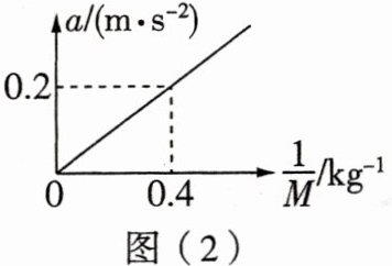 (2)按甲同学设计的装置完成实验,并根据实验得到的数据,画出小车的$a - \frac{1}{M}$图像如图(2)所示,从图像中可以得出,当小车的质量为$0.5\ kg$时,它的加速度大小为______$m/s^2$.(结果保留1位小数)