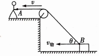 如图,一人通过一轻绳向左拉动物块,轻绳的左端水平,右端此时与水平方向的夹角为 $\theta$,轻绳的左端 $A$ 点此时的速度为 $v$,物块此时的速度为 $v_{物}$,$B$ 点是轻绳与物块的连接点.