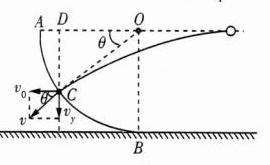 6. C 作出小球的运动轨迹,将小球在C点的速度沿水平和竖直方向进行分解,如图所示,小球在竖直方向做自由落体运动,则竖直分速度$v_y=\sqrt{2gh_{CD}} = 2\sqrt{15}$ m/s,小球垂直击中C点,速度的反向延长线过圆心,根据几何关系有$\sin\theta=\frac{h_{CD}}{R}=\frac{3}{5}$,可得$\tan\theta=\frac{3}{4}$,小球抛出时的速度$v_0=\frac{v_y}{\tan\theta}=\frac{8\sqrt{15}}{3}$ m/s,故C正确。