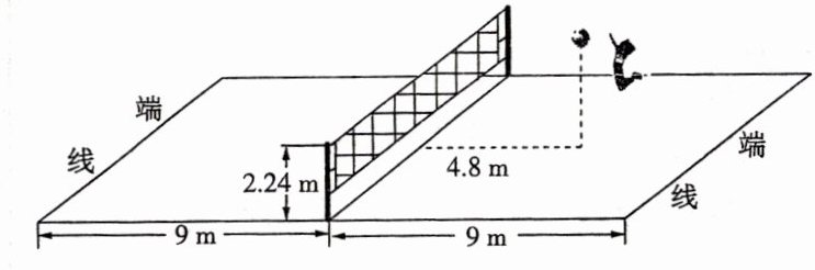 8. 如图所示,排球比赛中,某运动员在距网水平距离为$4.8\ m$、距地面$3.2\ m$高处将排球沿垂直网的方向以$16\ m/s$的速度水平击出. 已知网高为$2.24\ m$,排球场地长为$18\ m$,重力加速度$g$取$10\ m/s^{2}$,可将排球视为质点,下列判断正确的是 ( )