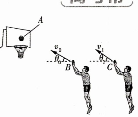 9. D 两次斜抛运动均可看作从篮板上A点做平抛运动的逆过程,第一次抛到B点,第二次抛到C点,下落的高度相同,因此运动时间相同,竖直分速度相同,落到C点时说明篮球的水平分速度更大,速度与水平面的夹角更小,因此$v_1>v_0$,$\theta_1<\theta_0$,A、B、C错误,D正确。