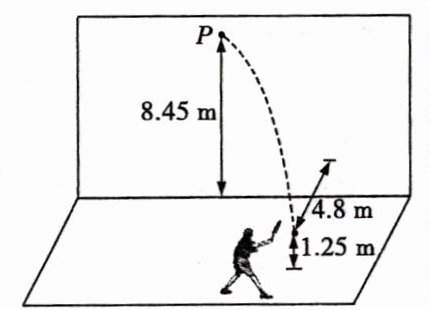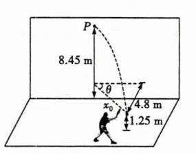 2.[斜抛运动/2022 山东/多选]如图所示,某同学将离地$h = 1.25\ m$的网球以$v_0 = 13\ m/s$的速度斜向上击出,击球点到竖直墙壁的距离$x = 4.8\ m$. 当网球竖直分速度为零时,击中墙壁上离地高度为$H = 8.45\ m$的P点. 网球与墙壁碰撞后,垂直于墙面速度分量大小变为碰前的0.75倍,平行于墙面的速度分量不变. 重力加速度$g = 10\ m/s^2$,网球碰墙后的速度大小v和着地点到墙壁的距离d分别为 ( )