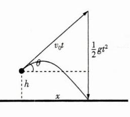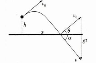 11. D 解法1:三角函数公式 + 判别式 设小球被抛出时速度$v_0$与水平方向夹角为θ,则 $x = v_0\cos\theta\cdot t$ $h=-v_0\sin\theta\cdot t+\frac{1}{2}gt^2$ 由于$\sin^2\theta+\cos^2\theta = 1$,因此有$(\frac{x}{v_0t})^2+(\frac{\frac{1}{2}gt^2 - h}{v_0t})^2 = 1$,整理得$\frac{1}{4}g^2t^4-(gh + v_0^2)t^2+h^2 + x^2 = 0$ 要使x最大,t应有唯一解,即 $\Delta=(gh + v_0^2)^2-4\times\frac{1}{4}g^2\times(h^2 + x_m^2)=0$ 解得$x_m=\frac{v_0}{g}\sqrt{v_0^2 + 2gh}$。D正确。 解法2:位移矢量图 + 配方 将小球的运动分解为沿初速度方向的匀速直线运动和竖直向下的自由落体运动,其位移矢量图如图所示。由几何知识可知$x^2=(v_0t)^2-(\frac{1}{2}gt^2 - h)^2=-\frac{1}{4}g^2t^4+(gh + v_0^2)t^2 - h^2=-\frac{1}{4}g^2[t^2-\frac{2(gh + v_0^2)}{g^2}]^2+\frac{v_0^2(2gh + v_0^2)}{g^2}$ 当$t^2=\frac{2(gh + v_0^2)}{g^2}$,即$t=\frac{\sqrt{2(gh + v_0^2)}}{g}$时,有最大射程$x_m=\frac{v_0\sqrt{v_0^2 + 2gh}}{g}$。D正确。 解法3:速度矢量三角形 + 数形结合 设小球落地时速度v与水平地面夹角为α,则v与初速度$v_0$、竖直分速度gt构成速度矢量三角形,如图所示。 三角形“面积”$S_{\triangle}=\frac{1}{2}\times gt\times v_0\cos\theta=\frac{1}{2}\times v\times v_0\sin(\alpha+\theta)$ 根据机械能守恒定律有$\frac{1}{2}mv^2=\frac{1}{2}mv_0^2 + mgh$ 又$x = v_0\cos\theta\cdot t$ 以上各式联立得$gx = v_0\sqrt{v_0^2 + 2gh}\sin(\alpha+\theta)$ 即$x=\frac{v_0\sqrt{v_0^2 + 2gh}}{g}\sin(\alpha+\theta)$ 由此可知,当$\alpha+\theta = 90^{\circ}$时,有最大射程$x_m=\frac{v_0\sqrt{v_0^2 + 2gh}}{g}$。D正确。