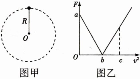 D 由图乙可知,当$v^{2}=b$时,杆对小球的弹力为 0,有$mg = m\frac{v^{2}}{R}$,则重力加速度$g = \frac{v^{2}}{R}=\frac{b}{R}$,故 A 错误;当小球速度$v<\sqrt{gR}$时,弹力为支持力,方向向上,由牛顿第二定律得$mg - F = m\frac{v^{2}}{R}$,因此有$F = mg - m\frac{v^{2}}{R}$,此时图线的斜率为$-\frac{a}{b}=-\frac{m}{R}$,则$m = \frac{aR}{b}$,故 B 错误;当$v^{2}=c>b$时,杆对小球的弹力为拉力,方向向下,故 C 错误;当$v^{2}=2b$时,弹力方向向下,因此有$mg + F = m\frac{v^{2}}{R}$,与$v^{2}=b$时相比较,得杆对小球弹力的大小为$mg$,故 D 正确。