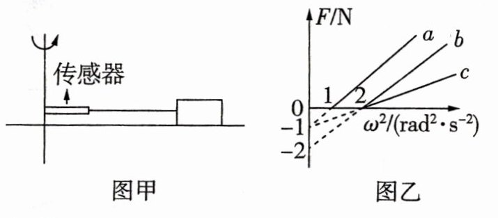 (3) 由题图乙知$a$的纵轴截距$-\mu_{a}m_{a}g=-1\ N$,$b$的纵轴截距$-\mu_{b}m_{b}g=-2\ N$,$c$的纵轴截距$-\mu_{c}m_{c}g=-1\ N$,结合质量之比得到物块$a$、$b$、$c$与转盘之间的动摩擦因数之比为$1:2:2$。