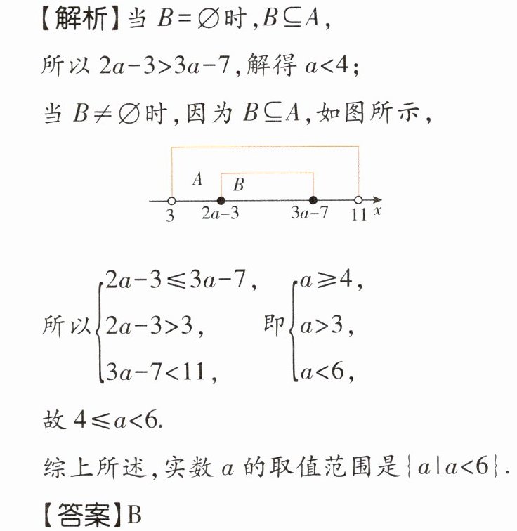 设集合A = {x|3<x<11},B = {x|2a - 3≤x≤3a - 7},若B⊆A,则实数a的取值范围是 ( )