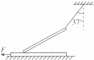 5. [河南周口2024联考]如图所示,质量为$m$、粗细均匀、质量分布均匀的直杆一端放置在水平面的长木板上,另一端用轻绳悬挂着. 用力向左拉长木板使其向左运动,直杆稳定时轻绳与竖直方向的夹角为$37^{\circ}$,直杆与长木板间动摩擦因数为$0.5$,重力加速度为$g$,则轻绳的拉力大小为($\sin 37^{\circ}=0.6,\cos 37^{\circ}=0.8$) ( )