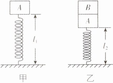 2. [江西赣州2025届开学考]如图所示,一轻质弹簧下端固定在水平面上,上端放一个质量为$2m$的物块$A$,物块$A$静止后弹簧长度为$l_{1}$,若在物块$A$上端再放一个质量为$m$的物块$B$,静止后弹簧长度为$l_{2}$,如图乙所示. 弹簧始终处于弹性限度内,重力加速度为$g$,则下列说法正确的是 ( )