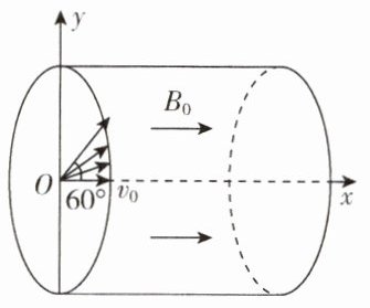 4.[重庆一中2024月考](多选)利用磁场实现粒子偏转或聚焦是科学仪器中广泛应用的技术. 如图所示,圆柱体真空管内存在与圆柱体中轴线x轴平行的向右的匀强磁场,磁感应强度大小为B₀,圆柱体半径为R,在左侧面圆心O处(O为坐标原点)有一粒子源,某时刻发射大量电荷量为+q、质量为m的粒子进入真空管,初速度方向在与x轴夹角为0~60°的同一竖直平面xOy内,初速度沿x轴方向的分量大小为v₀,粒子在磁场中做螺旋线运动,忽略粒子间的相互作用和磁场的边界效应,不计粒子重力,下列说法正确的是 ( )
