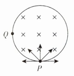3.[河北邯郸2024二模](多选)如图所示,半径为R的圆形区域内有一方向垂直纸面向里、磁感应强度大小为B的匀强磁场,P点有一粒子源,某时刻粒子源向磁场所在区域与磁场垂直的平面内所有方向发射大量质量为m、电荷量为q的带正电的粒子,粒子的速度大小相等,这些粒子射出磁场时的位置均位于PQ圆弧上且Q点为最远点. 已知PQ圆弧长等于磁场边界周长的四分之一,不计粒子重力和粒子间的相互作用,则 ( )