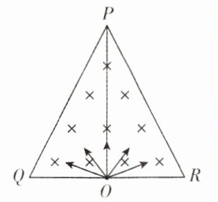 2.[山东济南2025届开学考](多选)如图所示,边长为2a的等边三角形PQR区域内存在垂直纸面向里的匀强磁场,磁感应强度大小为B. 底边中点O处有一粒子源,可平行于纸面向磁场内任意方向均匀发射同种带正电的粒子,粒子质量均为m,电荷量均为q,速度大小均为$v_{0}=\frac{aqB}{m}$. 不计粒子的重力及粒子之间的相互作用,下列说法正确的是 ( )