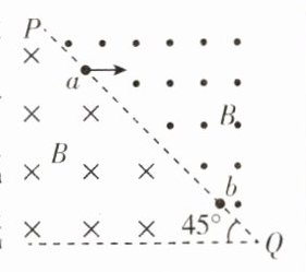 1.[湖南长沙2025届开学考](多选)如图所示,在某空间的一个区域内有一直线PQ与水平面成45°角,在PQ两侧存在垂直于纸面且方向相反的匀强磁场,磁感应强度大小为B. 从直线上的a点水平向右射出速率为v的粒子,粒子带正电,比荷为k,若粒子运动过程中经过直线PQ上的b点,粒子从a点运动到b点的时间为t. 已知ab = d,不计粒子重力. 则 ( )