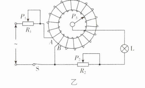6. [江西萍乡2025届期中改编]如图乙所示是一种理想自耦变压器示意图,线圈绕在一个圆环形的铁芯上,$P_3$是可移动的滑动触头,$A$、$B$端与滑动变阻器$R_1$串联后接正弦交流电源,输出端接灯泡L和滑动变阻器$R_2$,$P_1$、$P_2$为滑动变阻器的滑片. 当开关S闭合,输入端接电压如图甲所示,$P_1$、$P_2$、$P_3$处于如图所在的位置时,灯泡L能正常发光. 下列说法正确的是 ( )