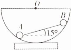 7.如图所示,一个内表面光滑的半球形的碗放在桌面上,碗口水平,O是球心,碗的半径为R,一根轻质杆的两端固定有A、B两个小球(可视为质点),质量分别是m_1、m_2,已知杆长为\sqrt{2}R,杆静止时与水平面的夹角为15°,则A、B两小球的质量之比是 ( )