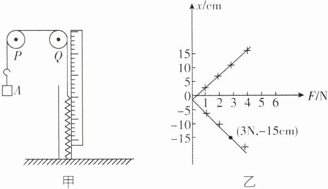 2. 某同学探究弹簧弹力大小与弹簧形变量的关系的实验装置如图甲所示,两光滑定滑轮固定于$P$、$Q$两点,一条轻绳跨过定滑轮$P$、$Q$,左端挂上钩码,其中钩码的个数可加减,绳子右端与弹簧上端连接,弹簧竖直固定在水平地面上,且弹簧外面套有一足够光滑、直径稍比弹簧外径大一些的透明圆筒,旁边竖直固定的刻度尺可以方便地读出弹簧的形变量. 根据平衡时左边所挂钩码的质量就可以得到弹簧的弹力大小,或者将定滑轮上的轻绳撤走后,在圆筒内的弹簧上面放钩码,读出此时钩码的质量和弹簧的压缩量,根据平衡条件就可以简单方便地将力与形变量的关系在坐标图中作出来,如图乙所示.