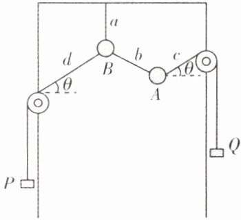 6. [浙江 2024年1月·6,3分]如图所示,在同一竖直平面内,小球A、B上系有不可伸长的细线a、b、c和d,其中a的上端悬挂于竖直固定的支架上,d跨过左侧定滑轮、c跨过右侧定滑轮分别与相同配重P、Q相连,调节左、右两侧定滑轮高度达到平衡. 已知小球A、B和配重P、Q质量均为50 g,细线c、d平行且与水平方向成θ = 30°角(不计摩擦),则细线a、b的拉力分别为